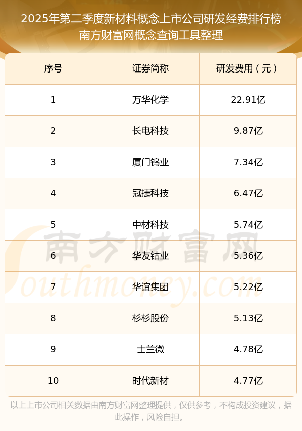 2025年第二季度新材料概念上市公司研發(fā)經(jīng)費排行榜如下:萬華化學(600309)研發(fā)經(jīng)費總額高達22.91億,長電科技(600584)和廈門鎢業(yè)(600549)分別位居第二和第三,冠捷科技(000727)、中材科技(002080)、華友鈷業(yè)(603799)、華誼集團(600623)、杉杉股份(600884)、士蘭微(600460)、時代新材(600458)分別進入前十,其研發(fā)經(jīng)費總額分別排名第4-10名。