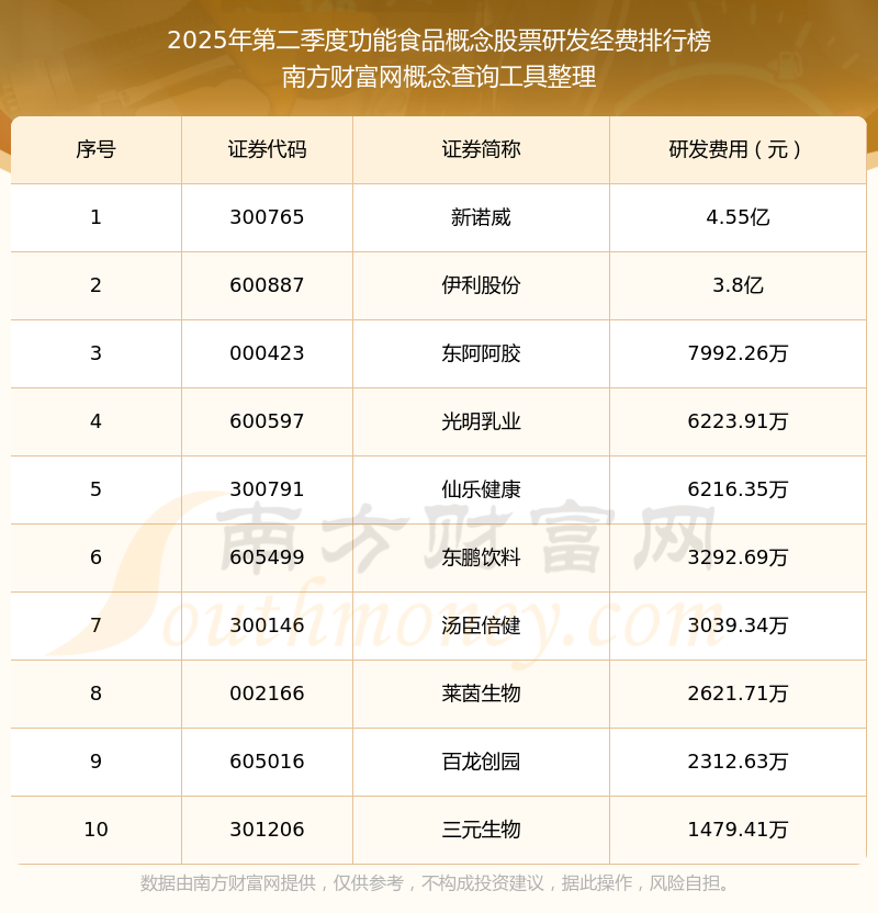 2025年第二季度,功能食品概念股票研發(fā)經(jīng)費排名如下:新諾威(300765)研發(fā)經(jīng)費總額高達(dá)4.55億,伊利股份(600887)和東阿阿膠(000423)分別位居第二和第三,光明乳業(yè)(600597)、仙樂健康(300791)、東鵬飲料(605499)、湯臣倍。300146)、萊茵生物(002166)、百龍創(chuàng)園(605016)、三元生物(301206)分別進(jìn)入前十,其研發(fā)經(jīng)費總額分別排名第4-10名。