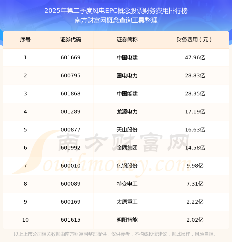 2025年第二季度,風電EPC概念股票財務費用排名如下:中國電建(601669)的財務費用總額高達47.96億,國電電力(600795)和中國能建(601868)分別位居第二和第三,龍源電力(001289)、天山股份(000877)、金隅集團(601992)、包鋼股份(600010)、特變電工(600089)、太原重工(600169)、明陽智能(601615)分別進入前十,其財務費用總額分別排名第4-10名。