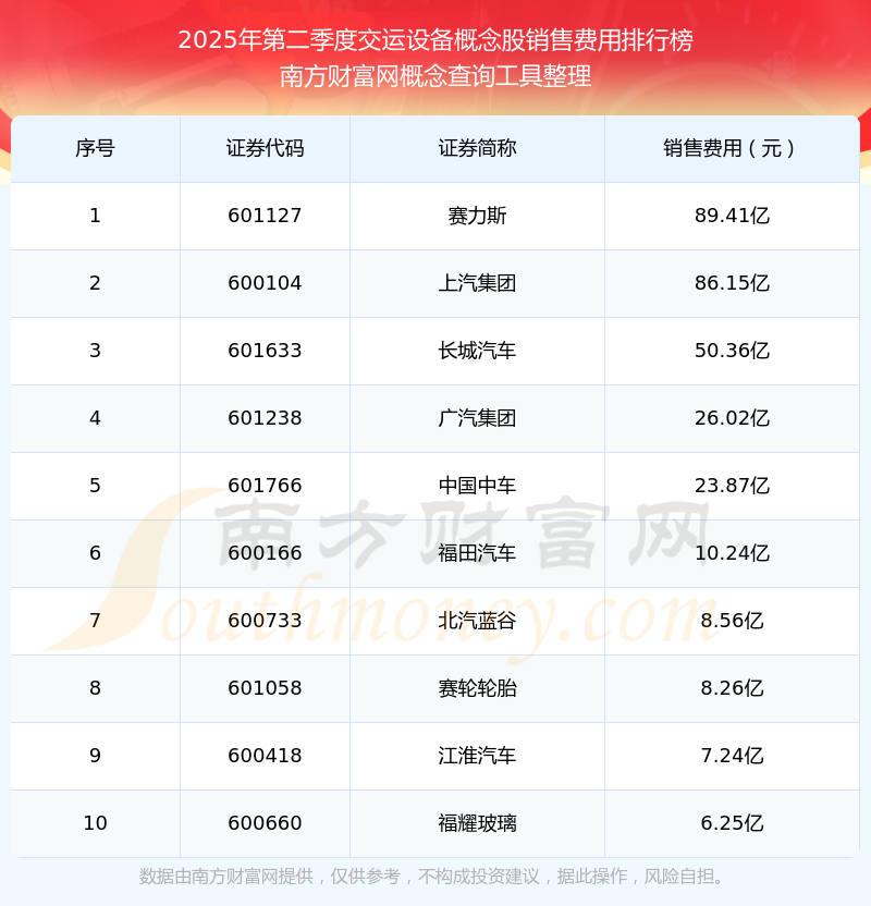 2025年第二季度,交運設(shè)備概念股銷售費用排名中,賽力斯(601127)銷售費用總額高達(dá)89.41億,上汽集團(tuán)(600104)和長城汽車(601633)排名第二和第三,廣汽集團(tuán)(601238)、中國中車(601766)、福田汽車(600166)、北汽藍(lán)谷(600733)、賽輪輪胎(601058)、江淮汽車(600418)、福耀玻璃(600660)進(jìn)入前十,銷售費用總額分別排名第4-10名。