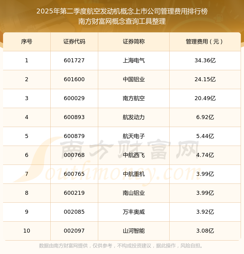 2025年第二季度,航空發(fā)動機概念上市公司管理費用排名如下:上海電氣(601727)的管理費用總額高達34.36億,中國鋁業(yè)(601600)和南方航空(600029)位居第二和第三,航發(fā)動力(600893)、航天電子(600879)、中航西飛(000768)、中航重機(600765)、南山鋁業(yè)(600219)、萬豐奧威(002085)、山河智能(002097)分別進入前十,其管理費用總額分別排名第4-10名。