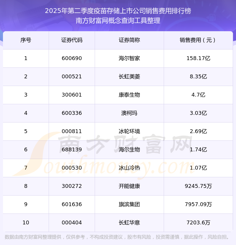 2025年第二季度,疫苗存儲上市公司銷售費用排行榜如下:海爾智家(600690)的銷售費用總額高達158.17億,長虹美菱(000521)和康泰生物(300601)分別位居第二和第三,澳柯瑪(600336)、冰輪環(huán)境(000811)、海爾生物(688139)、冰山冷熱(000530)、開能健康(300272)、旗濱集團(601636)、長虹華意(000404)分別進入前十,其銷售費用總額分別排名第4-10名。