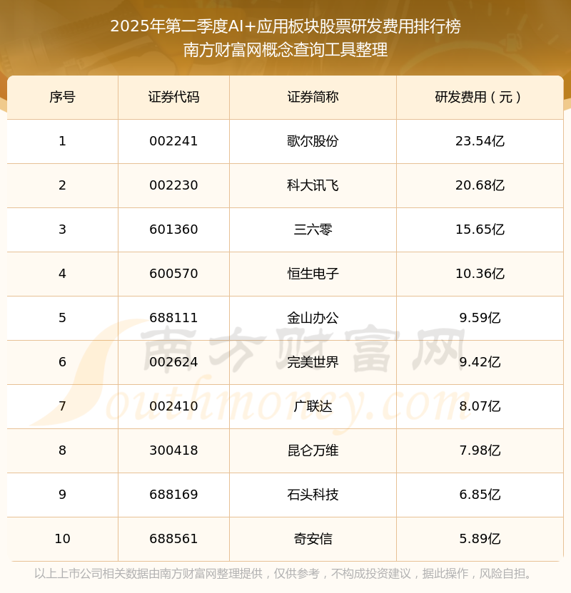 2025年第二季度,AI+應(yīng)用板塊股票研發(fā)費(fèi)用排行榜中,歌爾股份(002241)研發(fā)費(fèi)用總額高達(dá)23.54億,科大訊飛(002230)和三六零(601360)排名第二和第三,恒生電子(600570)、金山辦公(688111)、完美世界(002624)、廣聯(lián)達(dá)(002410)、昆侖萬維(300418)、石頭科技(688169)、奇安信(688561)進(jìn)入前十,研發(fā)費(fèi)用總額分別排名第4-10名。