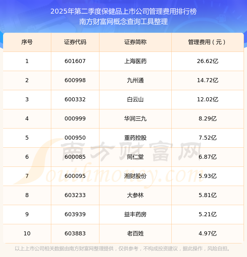 2025年第二季度,保健品上市公司管理費用排名中,上海醫(yī)藥(601607)的管理費用總額高達26.62億,九州通(600998)和白云山(600332)排名第二和第三,華潤三九(000999)、重藥控股(000950)、同仁堂(600085)、湘財股份(600095)、大參林(603233)、益豐藥房(603939)、老百姓(603883)進入前十,其管理費用總額分別排名第4-10名。