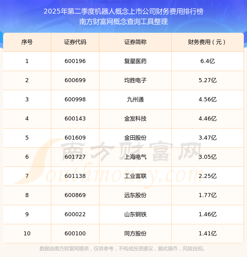 2025年第二季度機器人概念概念上市公司財務(wù)費用排行榜如下:復星醫(yī)藥(600196)的財務(wù)費用總額高達6.4億,均勝電子(600699)和九州通(600998)分別排名第二和第三,金發(fā)科技(600143)、金田股份(601609)、上海電氣(601727)、工業(yè)富聯(lián)(601138)、遠東股份(600869)、山東鋼鐵(600022)、同方股份(600100)分別進入前十,其財務(wù)費用總額分別排名第4-10名。