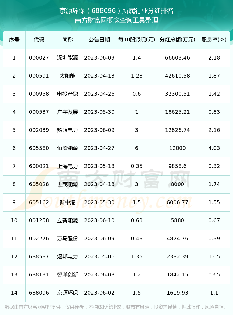 按照南方財(cái)富網(wǎng)趨勢(shì)選股系統(tǒng)統(tǒng)計(jì),京源環(huán)保所屬行業(yè)為電力行業(yè),電力行業(yè)分紅排名情況如下表: