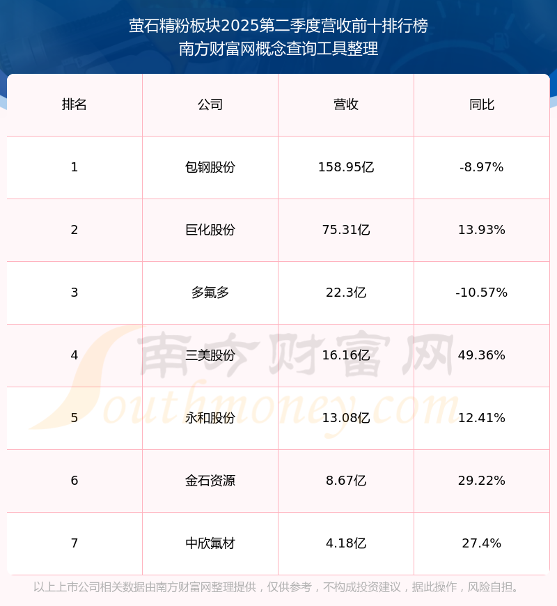 按照南方財富網(wǎng)概念查詢工具統(tǒng)計,該股所屬板塊為螢石精粉板塊,該板塊共有7只股票,金石資源2025第二季度營收在該板塊中排名為第6名,該板塊2025第二季度營收排名前十的股票如下表: