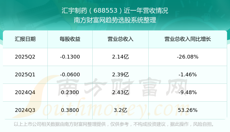 匯宇制藥2025年第二季度顯示,公司主營(yíng)收入2.14億元,同比-26.08%;歸母凈利潤(rùn)-5509.4萬(wàn)元,同比-393.4%;扣非凈利潤(rùn)1366.22萬(wàn)元,同比144.94%。