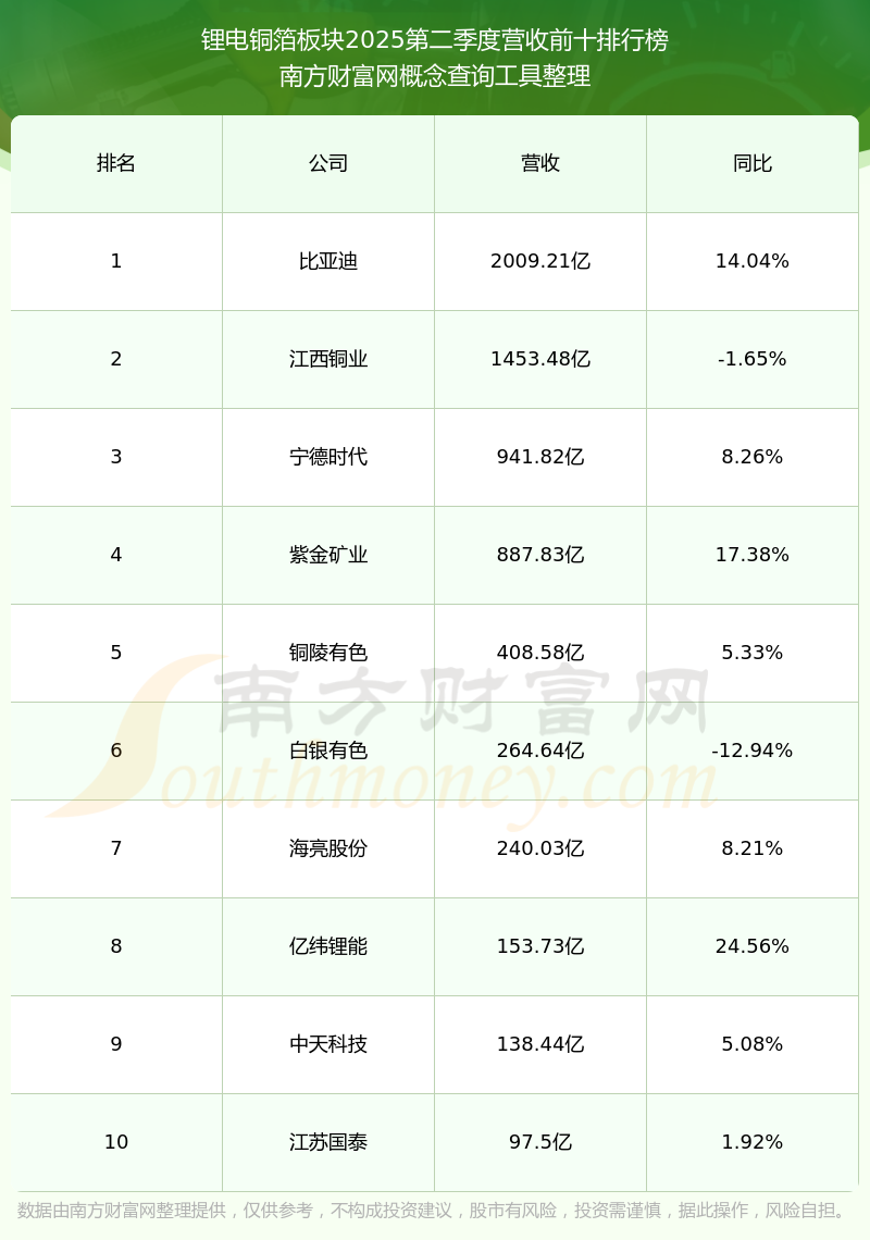 按照南方財(cái)富網(wǎng)概念查詢工具統(tǒng)計(jì),該股所屬板塊為鋰電銅箔板塊,該板塊共有36只股票,嘉元科技2025第二季度營收在該板塊中排名為第18名,該板塊2025第二季度營收排名前十的股票如下表: