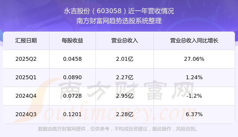 永吉股份2025年第二季度財報顯示,公司主營收入2.01億元,同比27.06%;歸母凈利潤1918.27萬元,同比-49.2%;扣非凈利潤928.28萬元,同比-73.9%;