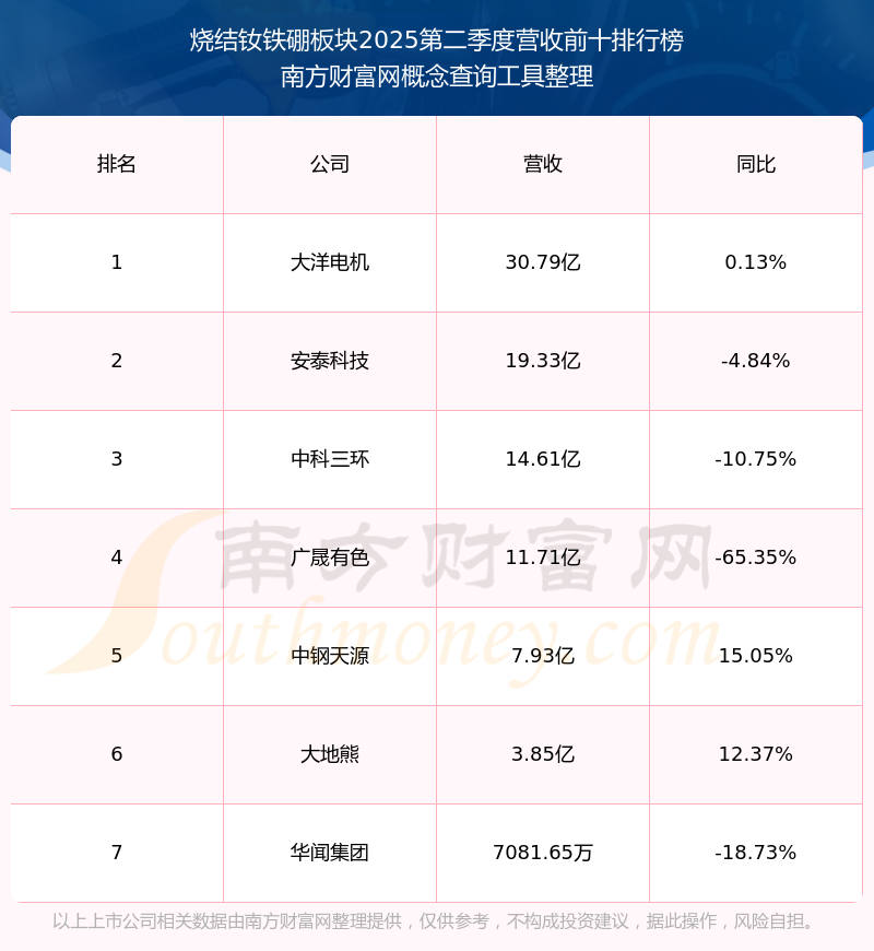 按照南方財富網(wǎng)概念查詢工具統(tǒng)計,該股所屬板塊為燒結(jié)釹鐵硼板塊,該板塊共有7只股票,大地熊2025第二季度營收在該板塊中排名為第6名,該板塊2025第二季度營收排名前十的股票如下表:
