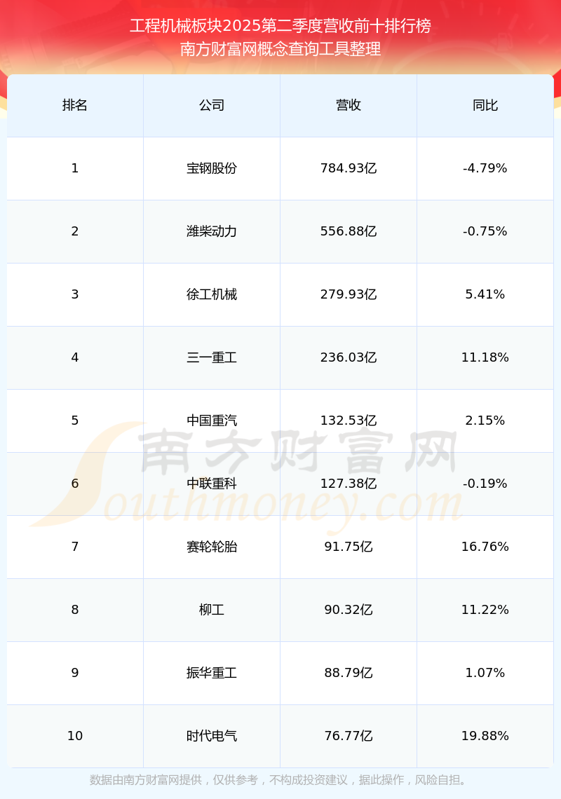 按照南方財(cái)富網(wǎng)概念查詢工具統(tǒng)計(jì),該股所屬板塊為工程機(jī)械板塊,該板塊共有100只股票,廈工股份2025第二季度營(yíng)收在該板塊中排名為第72名,該板塊2025第二季度營(yíng)收排名前十的股票如下表: