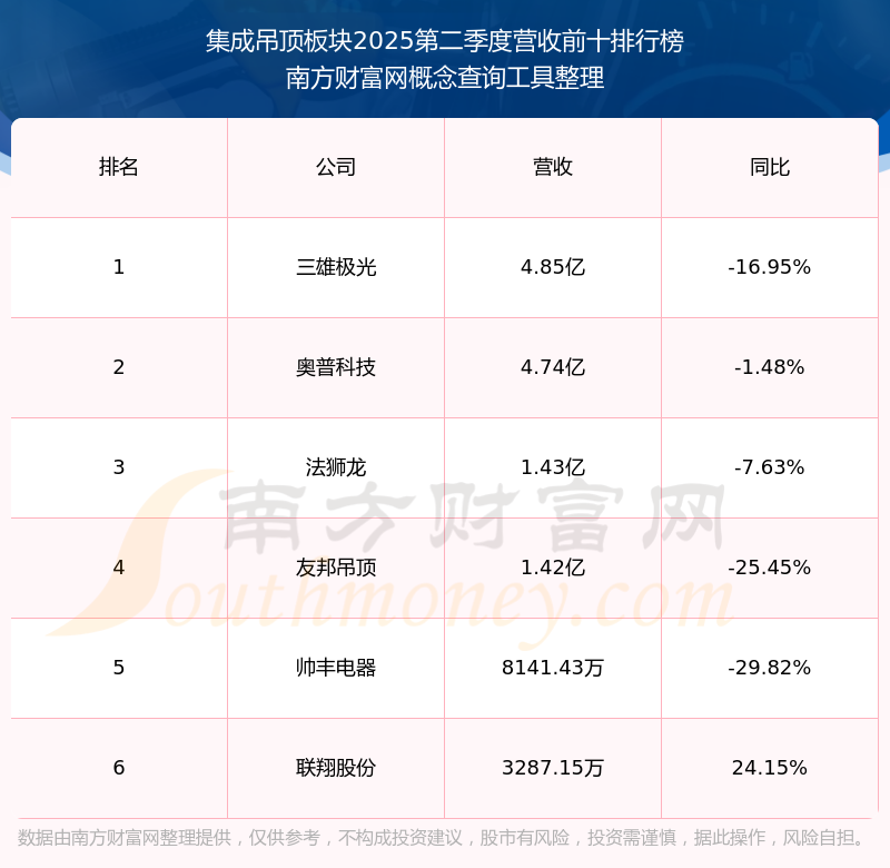 按照南方財富網(wǎng)概念查詢工具統(tǒng)計,該股所屬板塊為集成吊頂板塊,該板塊共有6只股票,法獅龍2025第二季度營收在該板塊中排名為第3名,該板塊2025第二季度營收排名前十的股票如下表: