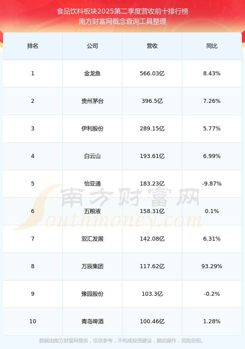 按照南方財(cái)富網(wǎng)概念查詢工具統(tǒng)計(jì),該股所屬板塊為食品飲料板塊,該板塊共有251只股票,泉陽泉2025第二季度營(yíng)收在該板塊中排名為第154名,該板塊2025第二季度營(yíng)收排名前十的股票如下表: