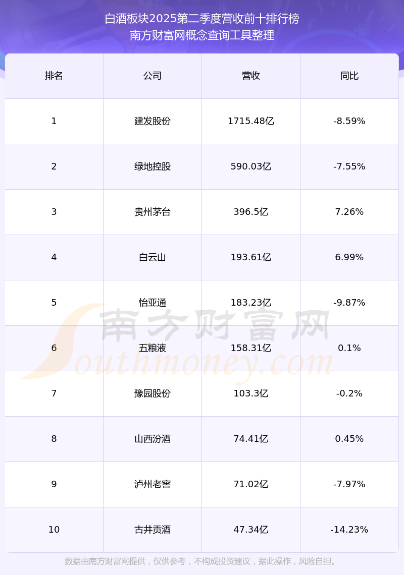 按照南方財(cái)富網(wǎng)概念查詢工具統(tǒng)計(jì),該股所屬板塊為白酒板塊,該板塊共有60只股票,迎駕貢酒2025第二季度營(yíng)收在該板塊中排名為第21名,該板塊2025第二季度營(yíng)收排名前十的股票如下表: