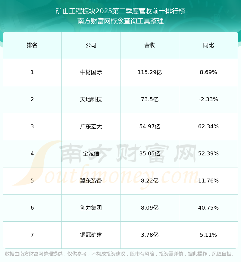 按照南方財富網(wǎng)概念查詢工具統(tǒng)計,該股所屬板塊為礦山工程板塊,該板塊共有7只股票,金誠信2025第二季度營收在該板塊中排名為第4名,該板塊2025第二季度營收排名前十的股票如下表:
