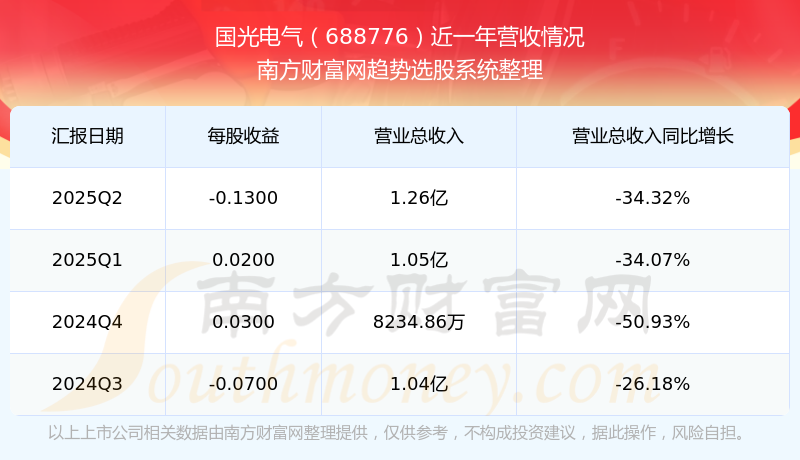 國光電氣(688776)披露2025年第二季度報(bào)告,報(bào)告期實(shí)現(xiàn)營收1.26億元,同比-34.32%;歸母凈利潤-1437.24萬元,同比-164.93%;扣非凈利潤-1837.9萬元,同比-198.5%。