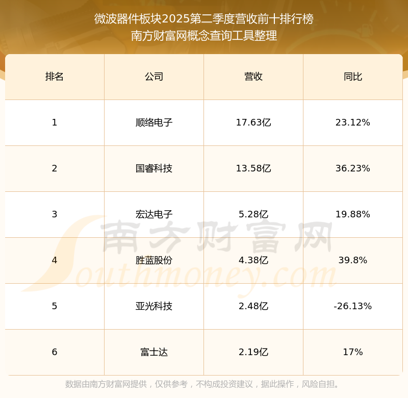 按照南方財(cái)富網(wǎng)概念查詢工具統(tǒng)計(jì),該股所屬板塊為微波器件板塊,該板塊共有6只股票,國光電氣2025第二季度營收在該板塊中排名為第6名,該板塊2025第二季度營收排名前十的股票如下表: