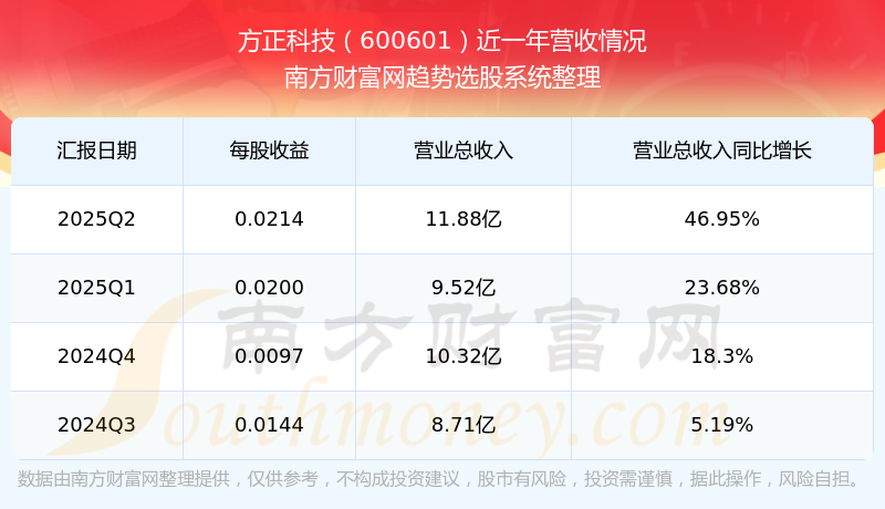 方正科技(600601)披露2025年第二季度報(bào)告,報(bào)告期實(shí)現(xiàn)營收11.88億元,同比46.95%;歸母凈利潤(rùn)9408.82萬元,同比29.3%;扣非凈利潤(rùn)9611.26萬元,同比39.43%。