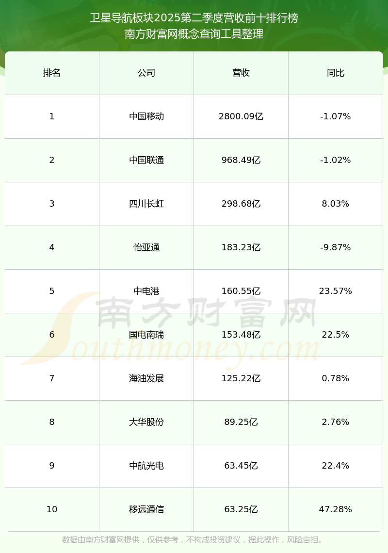 按照南方財(cái)富網(wǎng)概念查詢工具統(tǒng)計(jì),該股所屬板塊為衛(wèi)星導(dǎo)航板塊,該板塊共有226只股票,司南導(dǎo)航2025第二季度營(yíng)收在該板塊中排名為第173名,該板塊2025第二季度營(yíng)收排名前十的股票如下表:
