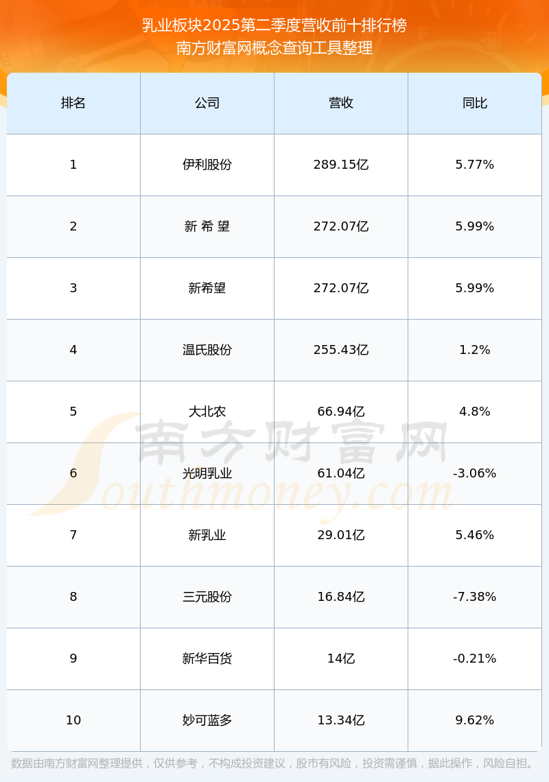 按照南方財富網(wǎng)概念查詢工具統(tǒng)計,該股所屬板塊為乳業(yè)板塊,該板塊共有39只股票,新農(nóng)開發(fā)2025第二季度營收在該板塊中排名為第36名,該板塊2025第二季度營收排名前十的股票如下表:
