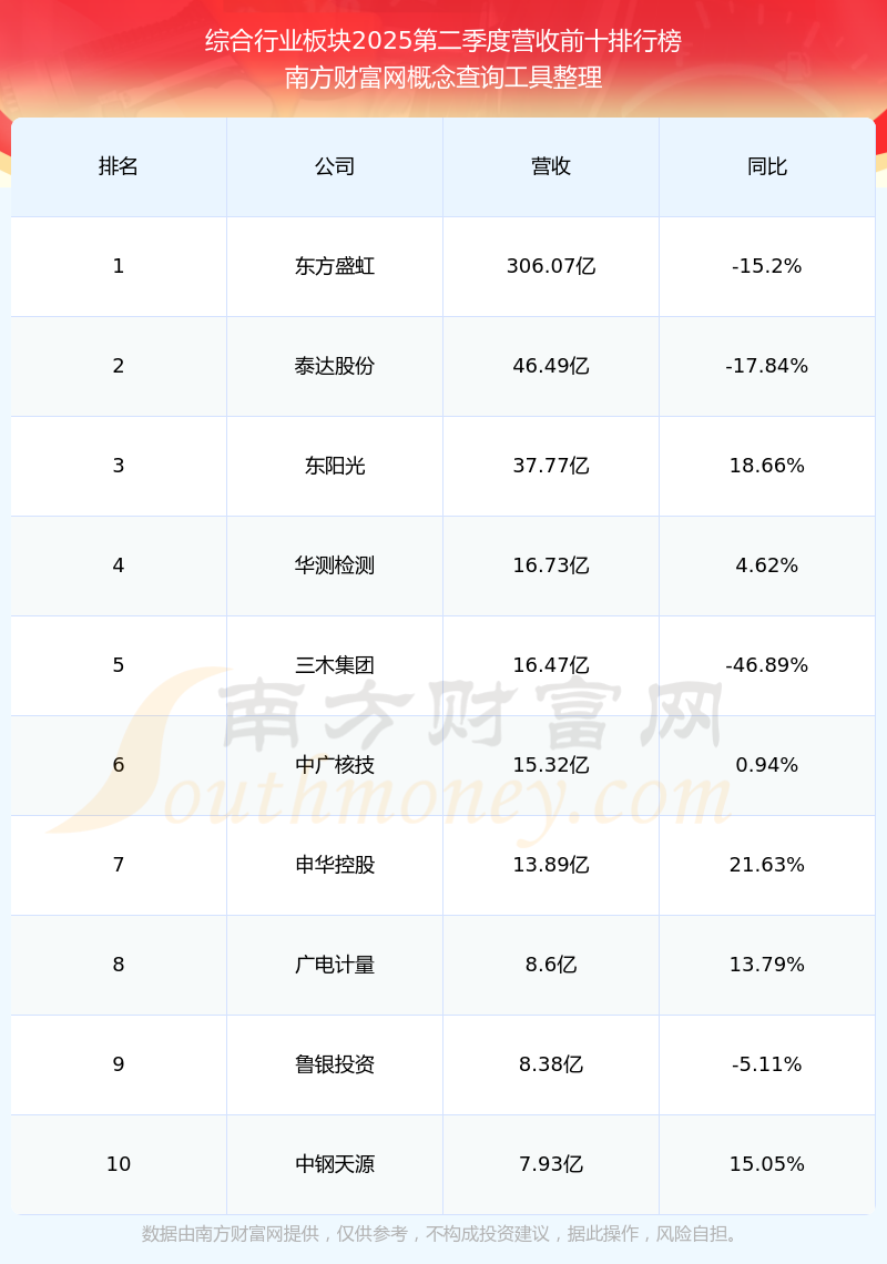 按照南方財富網(wǎng)概念查詢工具統(tǒng)計,該股所屬板塊為綜合行業(yè)板塊,該板塊共有25只股票,魯銀投資2025第二季度營收在該板塊中排名為第9名,該板塊2025第二季度營收排名前十的股票如下表: