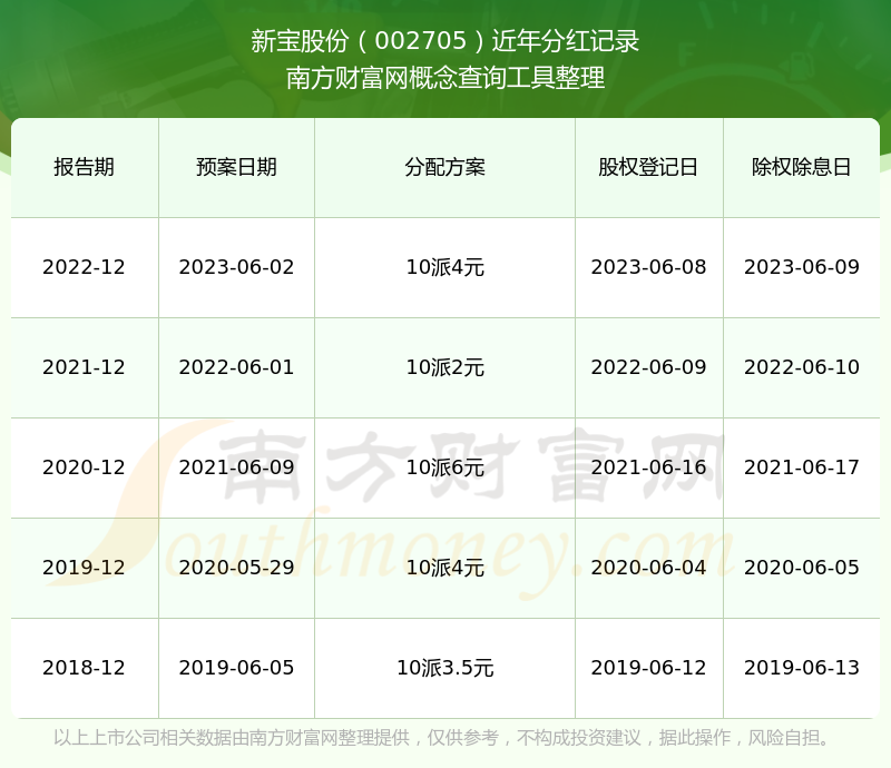 新寶股份最新一次公布的分紅方案為10派4元。本次權(quán)益分派股權(quán)登記日為2023年6月8日,除權(quán)除息日為2023年6月9日,派息日為2023年6月9日。
