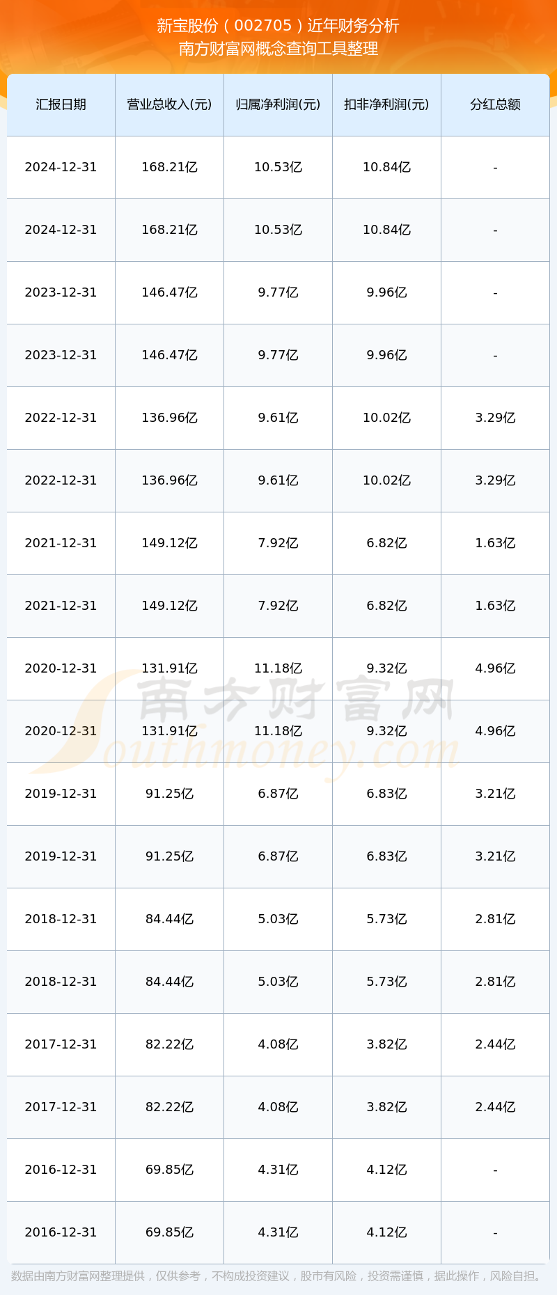 新寶股份公司2024年實現(xiàn)營業(yè)收入168.21億元,同比增長14.84%;凈利潤10.53億元,同比增長7.75%;毛利率20.91%。