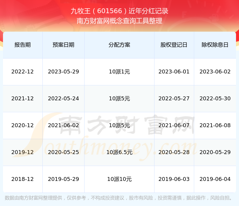 九牧王最新一次公布的分紅方案為10派1元。本次權(quán)益分派股權(quán)登記日為2023年6月1日,除權(quán)除息日為2023年6月2日,派息日為2023年6月2日。