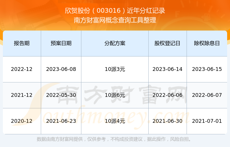 欣賀股份最新一次公布的分紅方案:10派3元。