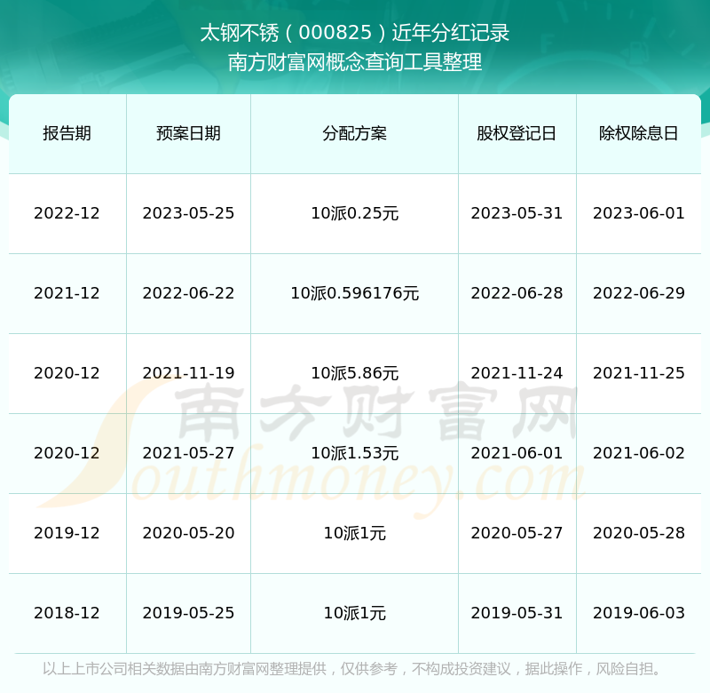 太鋼不銹最新一次公布的分紅方案為10派0.25元。本次權(quán)益分派股權(quán)登記日為2023年5月31日,除權(quán)除息日為2023年6月1日,派息日為2023年6月1日。