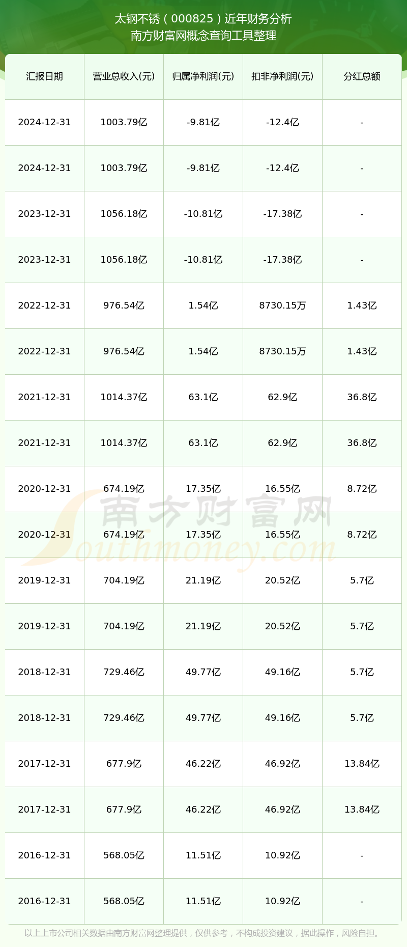 太鋼不銹2024年總營收1003.79億,同比增長-4.96%;凈利潤-9.81億,同比增長9.22%;銷售毛利率1.21%。