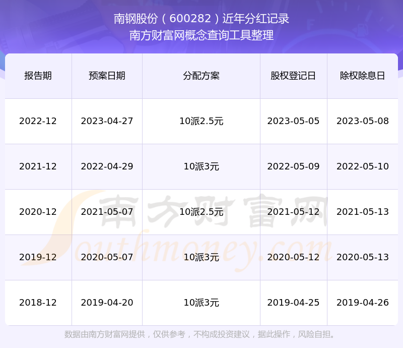 南鋼股份最新一次公布的分紅方案為10派2.5元。本次權(quán)益分派股權(quán)登記日為2023年5月5日,除權(quán)除息日為2023年5月8日,派息日為2023年5月8日。