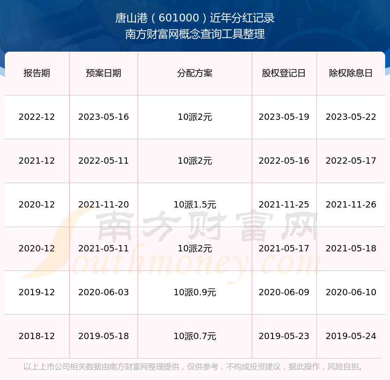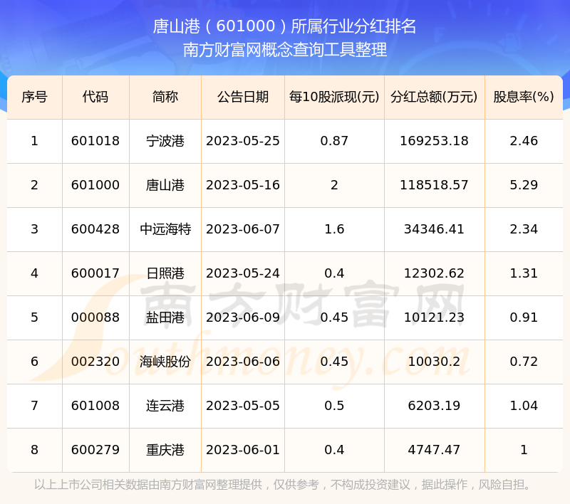 按照南方財富網(wǎng)趨勢選股系統(tǒng)統(tǒng)計,唐山港所屬行業(yè)為航運港口行業(yè),航運港口行業(yè)分紅排名情況如下表:
