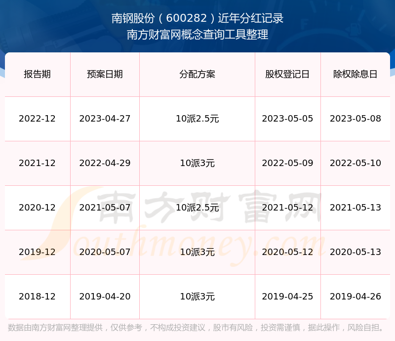 南鋼股份最新一次公布的分紅方案為10派2.5元。本次權(quán)益分派股權(quán)登記日為2023年5月5日,除權(quán)除息日為2023年5月8日,派息日為2023年5月8日。