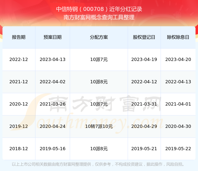 中信特鋼最新一次公布的分紅方案:10派7元。