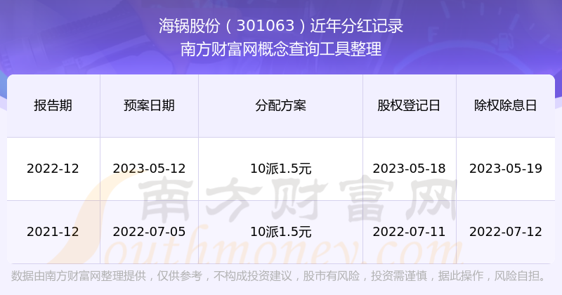 海鍋股份最新一次公布的分紅方案為10派1.5元。本次權(quán)益分派股權(quán)登記日為2023年5月18日,除權(quán)除息日為2023年5月19日,派息日為2023年5月19日。