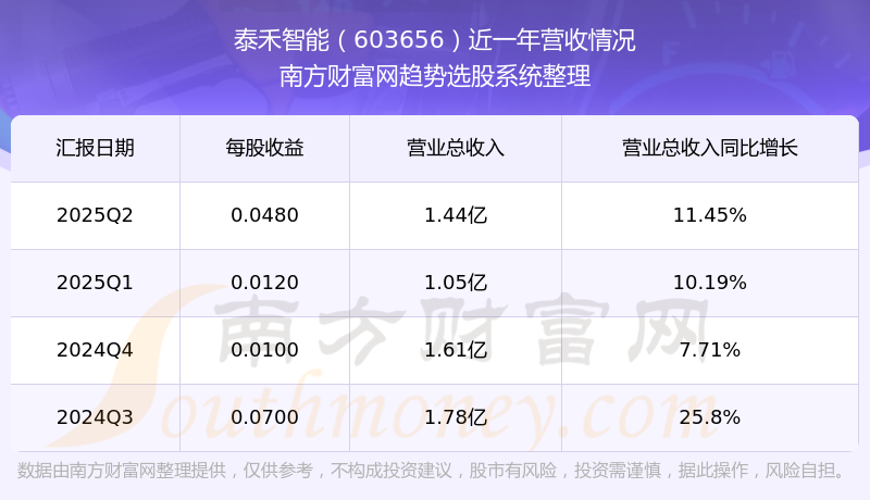 泰禾智能2025年第二季度公司實(shí)現(xiàn)營業(yè)收入1.44億元,同比11.45%;歸母凈利潤848.73萬元,同比34.64%。
