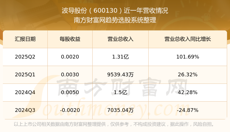 波導(dǎo)股份2025年第二季度顯示,公司主營收入1.31億元,同比101.69%;歸母凈利潤186.91萬元,同比-29.37%;扣非凈利潤-255.51萬元,同比-53.12%。