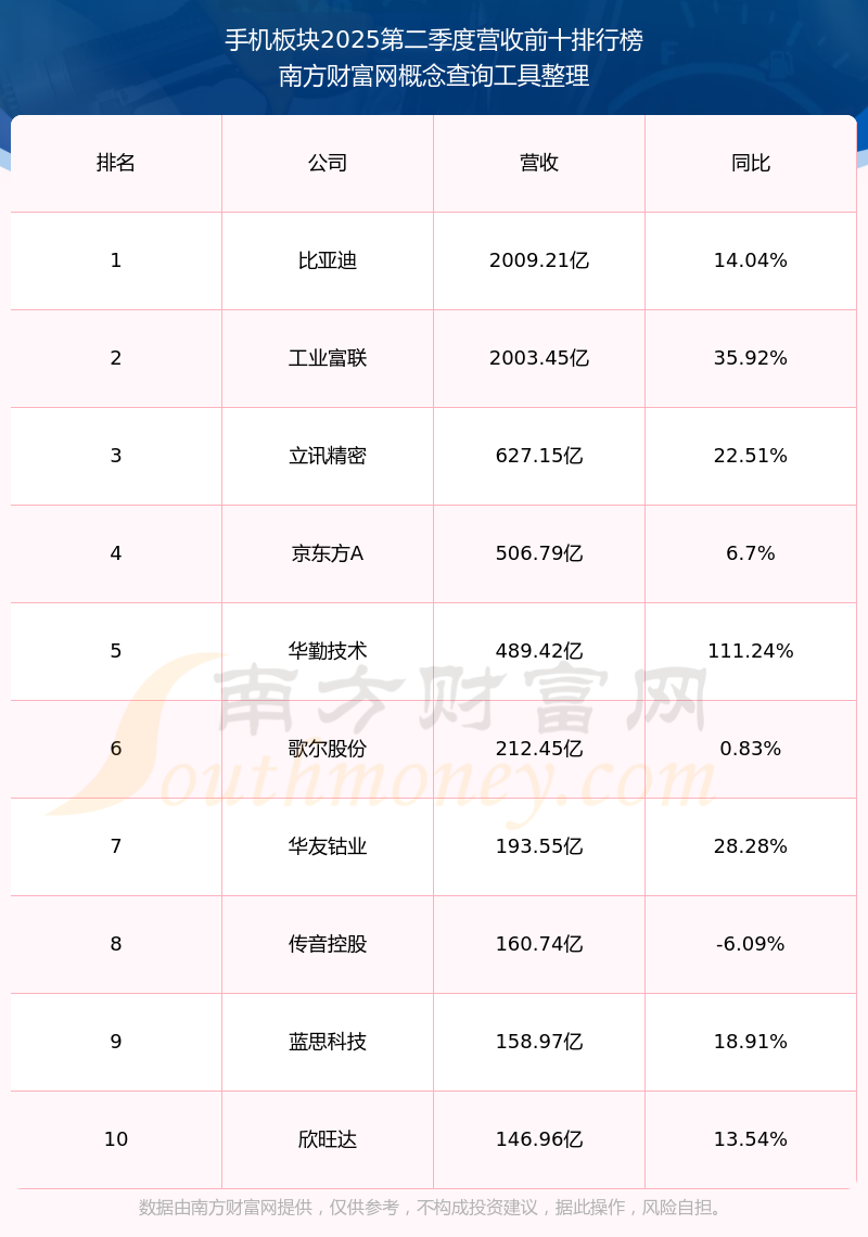 按照南方財(cái)富網(wǎng)概念查詢工具統(tǒng)計(jì),該股所屬板塊為手機(jī)板塊,該板塊共有138只股票,波導(dǎo)股份2025第二季度營收在該板塊中排名為第133名,該板塊2025第二季度營收排名前十的股票如下表: