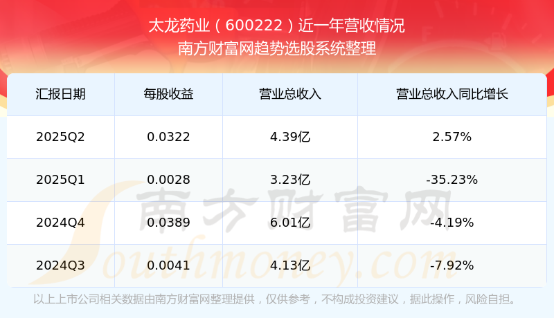 太龍藥業(yè)2025年第二季度財(cái)報(bào)顯示,公司主營(yíng)收入4.39億元,同比2.57%;歸母凈利潤(rùn)1781.6萬(wàn)元,同比232.43%;扣非凈利潤(rùn)1473.66萬(wàn)元,同比122.07%。