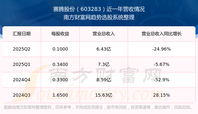 賽騰股份披露了2025年第二季度財報。報告顯示,賽騰股份2025年第二季度實現(xiàn)營收6.43億元,同比-24.96%;歸母凈利潤5415.1萬元,同比-9.23%。