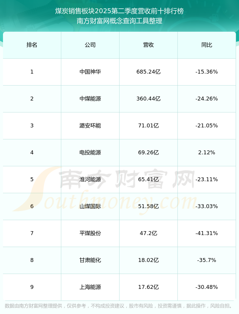按照南方財(cái)富網(wǎng)概念查詢工具統(tǒng)計(jì),該股所屬板塊為煤炭銷售板塊,該板塊共有9只股票,申能股份2025第二季度營(yíng)收在該板塊中排名為第9名,該板塊2025第二季度營(yíng)收排名前十的股票如下表: