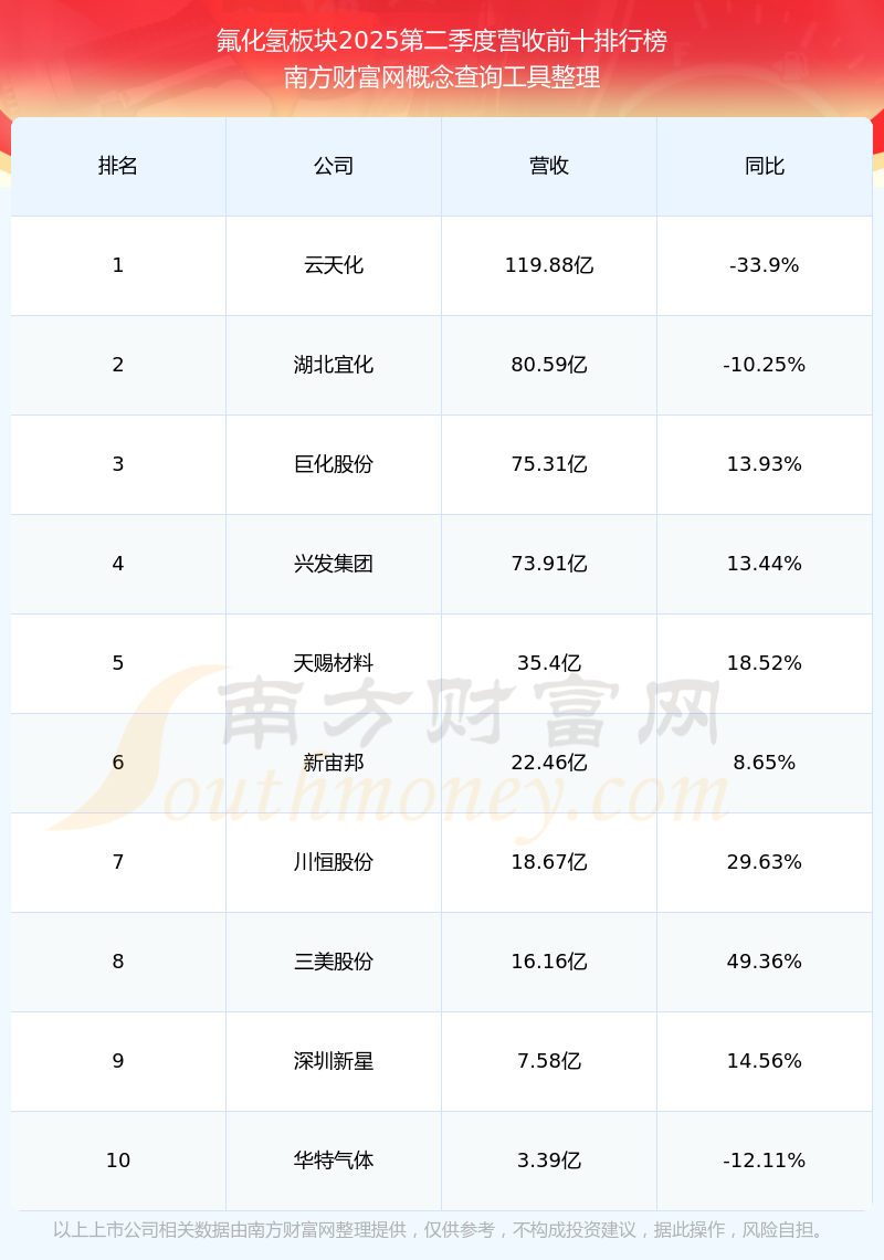 按照南方財富網(wǎng)概念查詢工具統(tǒng)計,該股所屬板塊為氟化氫板塊,該板塊共有11只股票,三美股份2025第二季度營收在該板塊中排名為第8名,該板塊2025第二季度營收排名前十的股票如下表: