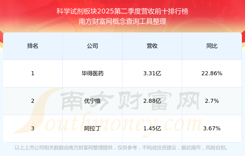 按照南方財(cái)富網(wǎng)概念查詢(xún)工具統(tǒng)計(jì),該股所屬板塊為科學(xué)試劑板塊,該板塊共有3只股票,畢得醫(yī)藥2025第二季度營(yíng)收在該板塊中排名為第1名,該板塊2025第二季度營(yíng)收排名前十的股票如下表: