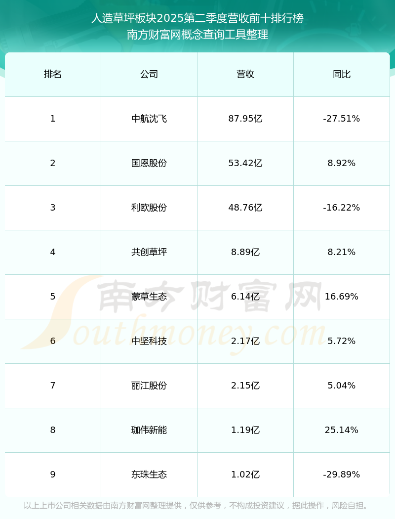 按照南方財富網(wǎng)概念查詢工具統(tǒng)計,該股所屬板塊為人造草坪板塊,該板塊共有9只股票,共創(chuàng)草坪2025第二季度營收在該板塊中排名為第4名,該板塊2025第二季度營收排名前十的股票如下表: