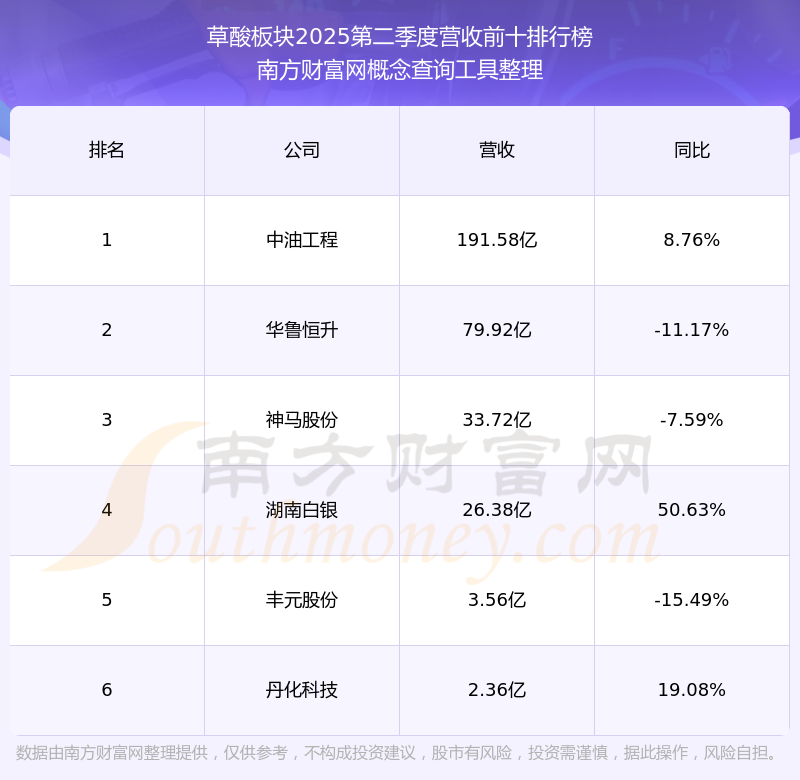 按照南方財(cái)富網(wǎng)概念查詢工具統(tǒng)計(jì),該股所屬板塊為草酸板塊,該板塊共有6只股票,丹化科技2025第二季度營(yíng)收在該板塊中排名為第6名,該板塊2025第二季度營(yíng)收排名前十的股票如下表: