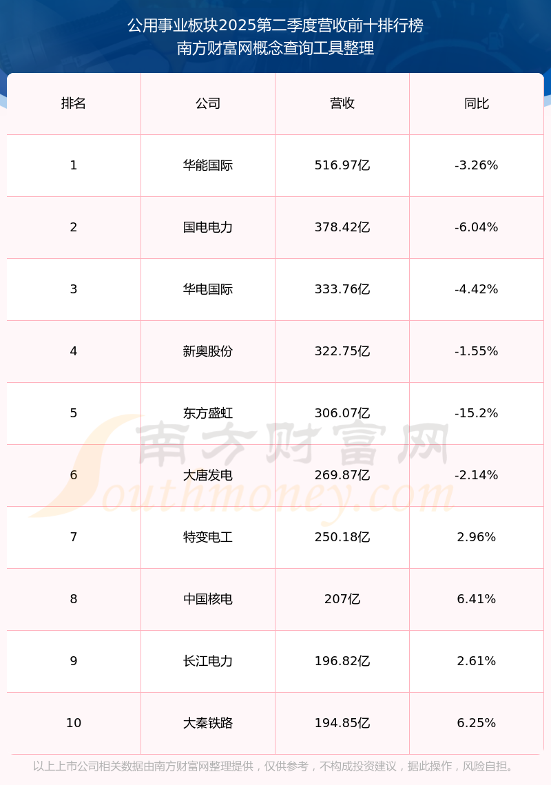 按照南方財(cái)富網(wǎng)概念查詢工具統(tǒng)計(jì),該股所屬板塊為公用事業(yè)板塊,該板塊共有190只股票,江南水務(wù)2025第二季度營收在該板塊中排名為第152名,該板塊2025第二季度營收排名前十的股票如下表: