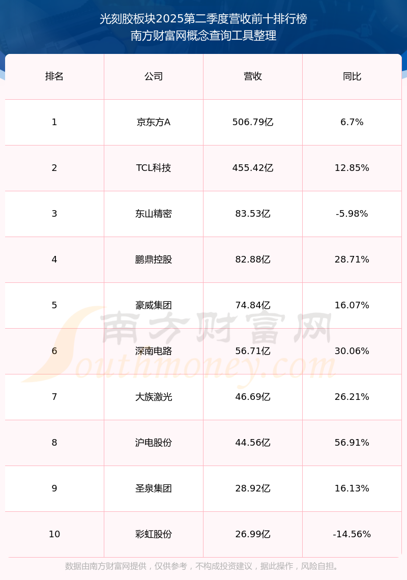 按照南方財富網(wǎng)概念查詢工具統(tǒng)計,該股所屬板塊為光刻膠板塊,該板塊共有92只股票,華懋科技2025第二季度營收在該板塊中排名為第37名,該板塊2025第二季度營收排名前十的股票如下表: