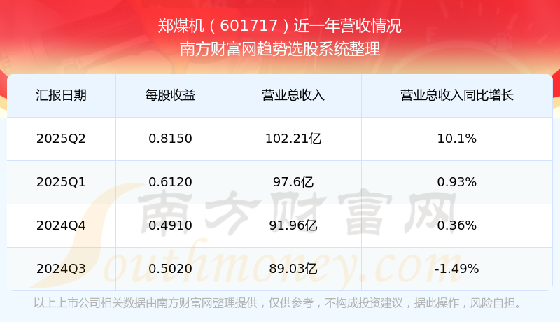 鄭煤機(jī)發(fā)布2025年第二季度財報。實現(xiàn)總營收102.21億元,同比增長10.1%;扣非凈利潤同比增長13.32%至11.45億元。